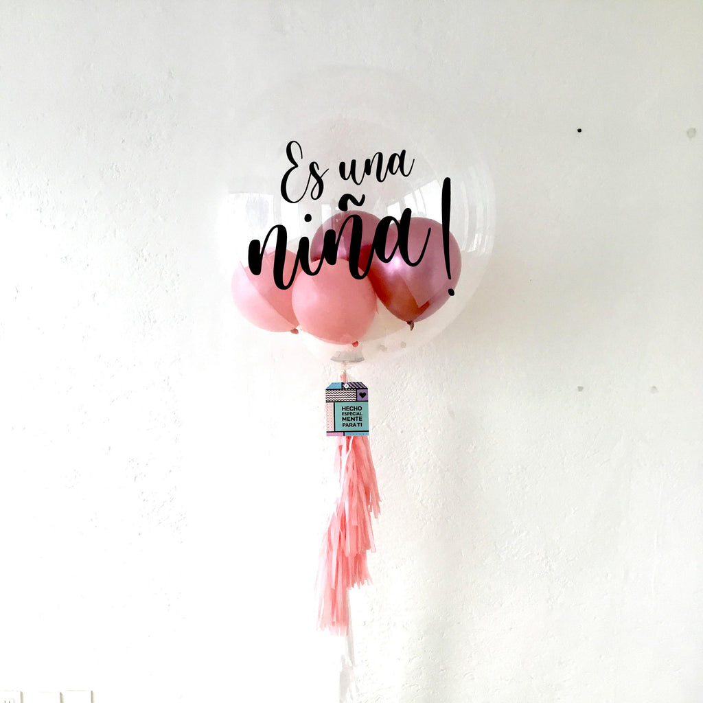 Globo gigante transparente con mini globos "ES UNA NIÑA" (90 cm) (Envío CDMX y zonas Edo Mex)